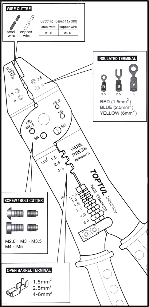 Главное отличие от аналогичных клещей TOPTUL DIBB1009 состоит в том, что в центральной части возможен обжим другого вида клемм.
