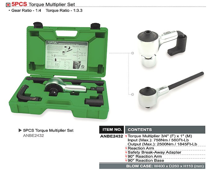 Множитель крутящего момента 3/4" (Мама) x 1" (Папа) Входное усилие (Max.): 758Nm / 560Ft-Lb Выходное усили (Max.): 2500Nm / 1845Ft-Lb |