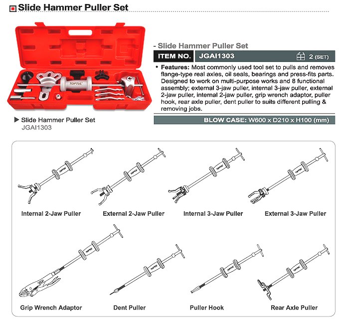 Съемник универсальный (инерционный) TOPTUL JGAI1303 сочетает в себе 8 видов съемников. А с помощью обратного молотка возможен простой и эффективный съем любого узла или механизма.